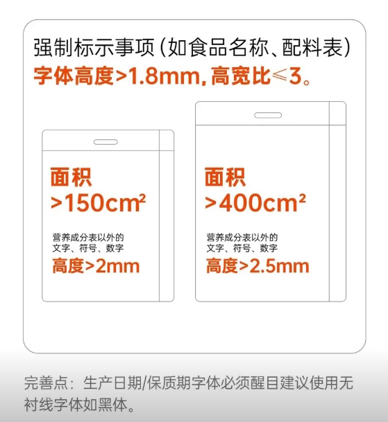 文字要求:强制标示内容需使用规范汉字,字体高度不小于 1.8 毫米,与背景对比明显。